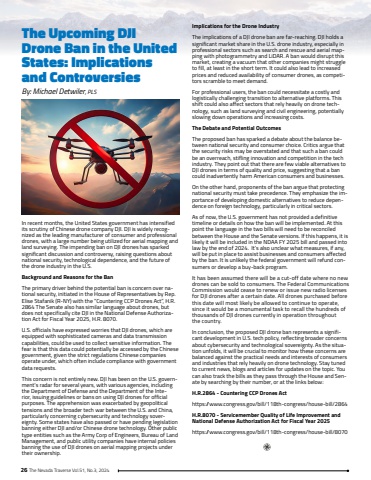 26 The Nevada Traverse Vol.51, No.3, 2024The Upcoming DJI Drone Ban in the United States: Implications and ControversiesBy: Michael Detwiler, PLSIn recent months, the United States government has intensified its scrutiny of Chinese drone company DJI. DJI is widely recognized as the leading manufacturer of consumer and professional drones, with a large number being utilized for aerial mapping and land surveying. The impending ban on DJI drones has sparked significant discussion and controversy, raising questions about national security, technological dependence, and the future of the drone industry in the U.S.Background and Reasons for the BanThe primary driver behind the potential ban is concern over national security, initiated in the House of Representatives by Rep. Elise Stafanik (R-NY) with the %u201cCountering CCP Drones Act%u201d, H.R. 2864 The Senate also has similar language about drones, but does not specifically cite DJI in the National Defense Authorization Act for Fiscal Year 2025, H.R. 8070. U.S. officials have expressed worries that DJI drones, which are equipped with sophisticated cameras and data transmission capabilities, could be used to collect sensitive information. The fear is that this data could potentially be accessed by the Chinese government, given the strict regulations Chinese companies operate under, which often include compliance with government data requests.This concern is not entirely new. DJI has been on the U.S. government%u2019s radar for several years, with various agencies, including the Department of Defense and the Department of the Interior, issuing guidelines or bans on using DJI drones for official purposes. The apprehension was exacerbated by geopolitical tensions and the broader tech war between the U.S. and China, particularly concerning cybersecurity and technology sovereignty. Some states have also passed or have pending legislation banning either DJI and/or Chinese drone technology. Other public type entities such as the Army Corp of Engineers, Bureau of Land Management, and public utility companies have internal policies banning the use of DJI drones on aerial mapping projects under their ownership.Implications for the Drone IndustryThe implications of a DJI drone ban are far-reaching. DJI holds a significant market share in the U.S. drone industry, especially in professional sectors such as search and rescue and aerial mapping with photogrammetry and LiDAR. A ban would disrupt this market, creating a vacuum that other companies might struggle to fill, at least in the short term. It could also lead to increased prices and reduced availability of consumer drones, as competitors scramble to meet demand.For professional users, the ban could necessitate a costly and logistically challenging transition to alternative platforms. This shift could also affect sectors that rely heavily on drone technology, such as land surveying and civil engineering, potentially slowing down operations and increasing costs.The Debate and Potential OutcomesThe proposed ban has sparked a debate about the balance between national security and consumer choice. Critics argue that the security risks may be overstated and that such a ban could be an overreach, stifling innovation and competition in the tech industry. They point out that there are few viable alternatives to DJI drones in terms of quality and price, suggesting that a ban could inadvertently harm American consumers and businesses.On the other hand, proponents of the ban argue that protecting national security must take precedence. They emphasize the importance of developing domestic alternatives to reduce dependence on foreign technology, particularly in critical sectors.As of now, the U.S. government has not provided a definitive timeline or details on how the ban will be implemented. At this point the language in the two bills will need to be reconciled between the House and the Senate versions. If this happens, it is likely it will be included in the NDAA FY 2025 bill and passed into law by the end of 2024. It%u2019s also unclear what measures, if any, will be put in place to assist businesses and consumers affected by the ban. It is unlikely the federal government will refund consumers or develop a buy-back program.It has been assumed there will be a cut-off date where no new drones can be sold to consumers. The Federal Communications Commission would cease to renew or issue new radio licenses for DJI drones after a certain date. All drones purchased before this date will most likely be allowed to continue to operate, since it would be a monumental task to recall the hundreds of thousands of DJI drones currently in operation throughout the country.In conclusion, the proposed DJI drone ban represents a significant development in U.S. tech policy, reflecting broader concerns about cybersecurity and technological sovereignty. As the situation unfolds, it will be crucial to monitor how these concerns are balanced against the practical needs and interests of consumers and industries that rely heavily on drone technology. Stay tuned to current news, blogs and articles for updates on the topic. You can also track the bills as they pass through the House and Senate by searching by their number, or at the links beloH.R.2864 - Countering CCP Drones Act https://www.congress.gov/bill/118th-congress/house-bill/2864H.R.8070 - Servicemember Quality of Life Improvement and National Defense Authorization Act for Fiscal Year 2025https://www.congress.gov/bill/118th-congress/house-bill/8070